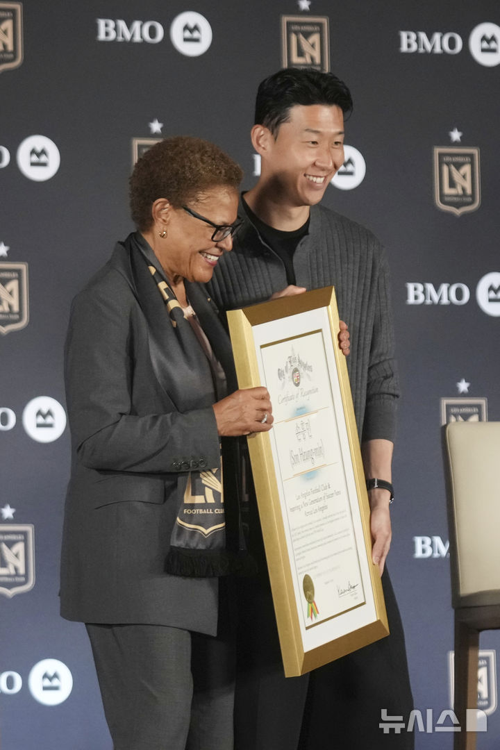 [로스앤젤레스=AP/뉴시스] 손흥민(오른쪽)이 6일(현지 시간) 미 캘리포니아주 로스앤젤레스(LA)의 BMO 스타디움에서 미국프로축구(MLS) LA FC 입단 기자회견을 하면서 캐런 베이스 LA 시장과 함께 인증서를 들고 포즈를 취하고 있다. 2025.08.07.