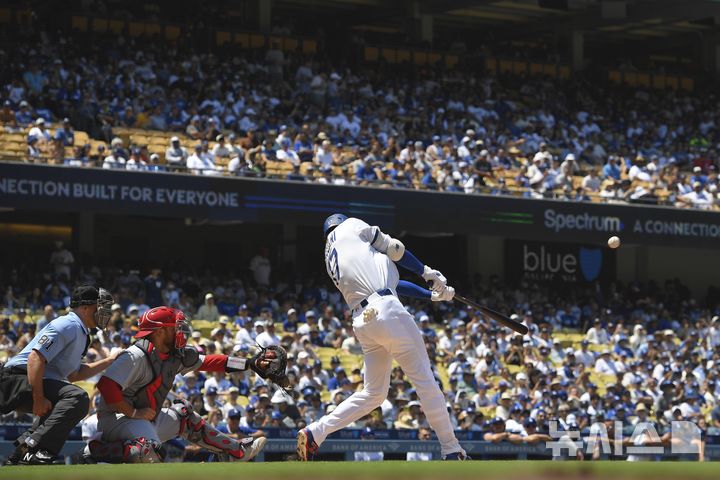 [로스앤젤레스=AP/뉴시스] LA 다저스의 오타니 쇼헤이가 6일(현지 시간) 미 캘리포니아주 로스앤젤레스의 다서 스타디움에서 열린 2025 메이저리그 세인트루이스 카니덜스와의 경기 3회 말 2점 홈런(시즌 39호)이자 자신의 MLB 통산 1000번째 안타를 치고 있다. 이날 오타니는 선발 투수로 4이닝 1실점 2피안타 8탈삼진을, 타자로서는 3타수 1안타 2타점 1득점 1볼넷 1삼진을 기록했고, 다저스는 3-5로 역전패했다. 2025.08.07.
