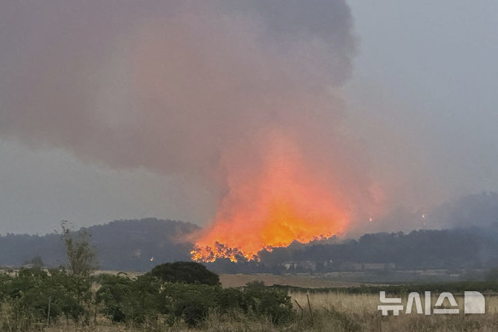 [코르비에르=AP/뉴시스] 6일(현지 시간) 프랑스 남부 오드주 코르비에르 인근에서 발생한 올여름 최대의 산불로 불길이 치솟고 있다. 지난 5일 시작된 이 산불은 고온·강풍으로 확산하면서 지금까지 1명이 숨지고 9명이 부상한 것으로 전해졌다. 2025.08.07.