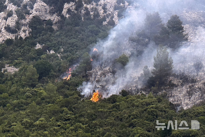 [코르비에르=AP/뉴시스] 6일(현지 시간) 프랑스 남부 오드주 코르비에르 인근에서 발생한 올여름 최대의 산불로 수목이 불에 타고 있다. 지난 5일 시작된 이 산불은 고온·강풍으로 확산하면서 지금까지 1명이 숨지고 9명이 부상한 것으로 전해졌다. 2025.08.07.