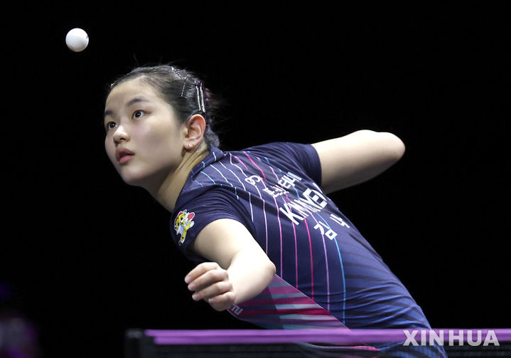 [요코하마=신화/뉴시스] 김나영이 7일 일본 요코하마에서 열린 월드테이블테니스(WTT) 챔피언스 요코하마 2025 여자 단식 1회전에서 콰이만(4위·중국)과 경기하고 있다. 김나영이 1-3(6-11 8-11 11-8 6-1)으로 패해 탈락했다. 2025.08.07.