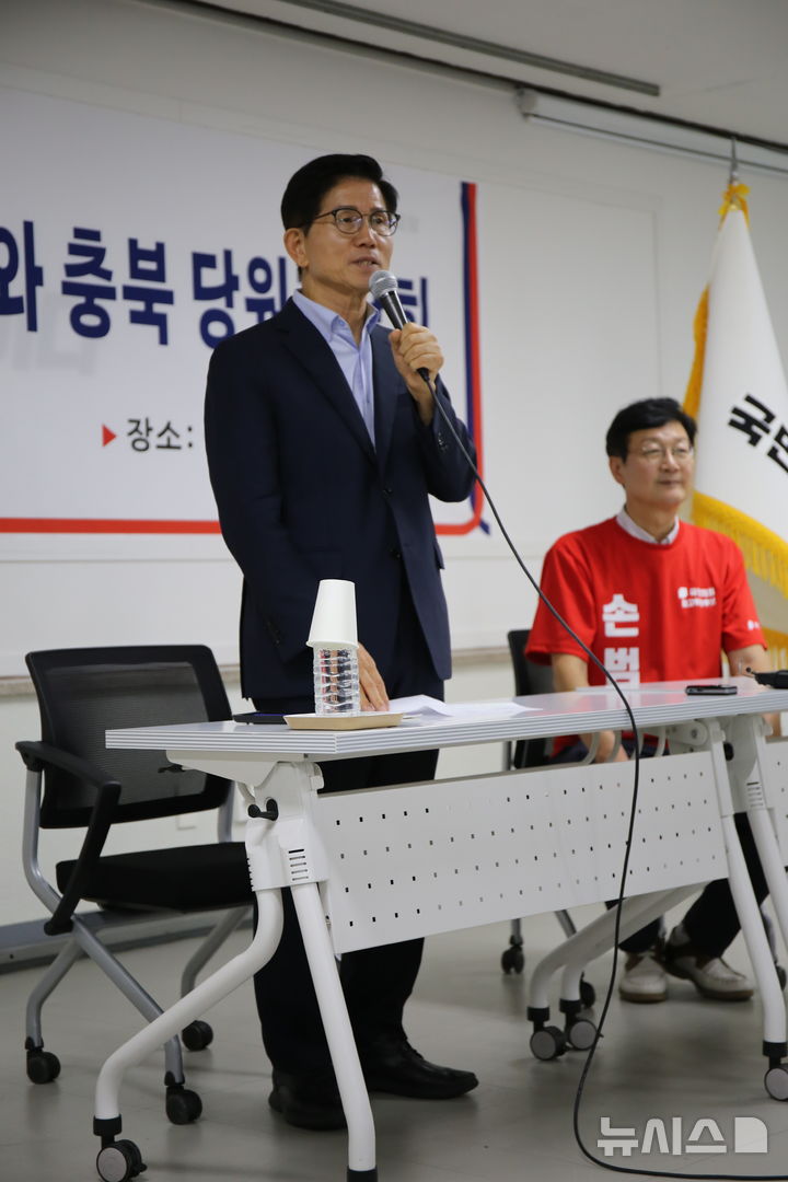 [청주=뉴시스] 연현철 기자 = 김문수(왼쪽) 국민의힘 당 대표 후보가 7일 충북 청주시 흥덕구 복대동 국민의힘 충북도당 회의실에서 열린 충북 당원간담회에 참석해 인사말을 하고 있다. 2025.08.07. [email protected]