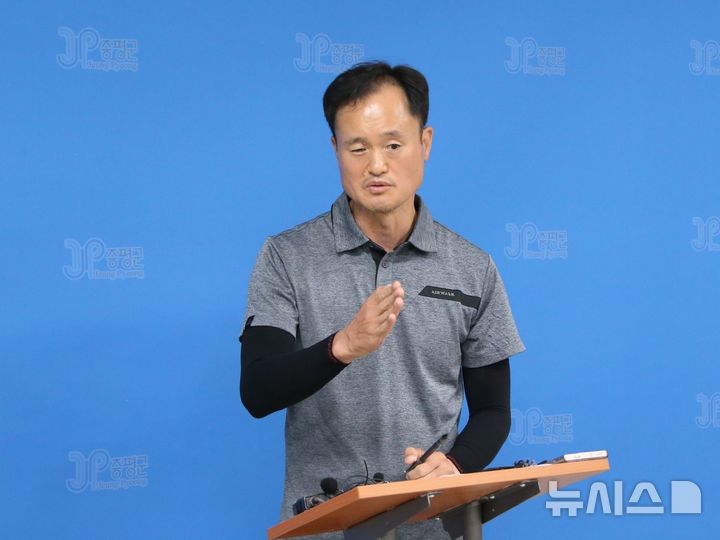 [증평=뉴시스] 허영준 한국수자원공사 충주수도지사 부장이 7일 충북 증평군청 브리핑실에서 송수관로 누수에 따른 단수 사태 및 복구 현황을 설명하고 있다. (사진=독자 제공) 2025.08.07. [email protected]