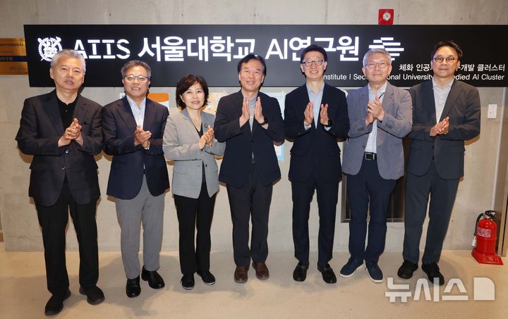 [서울=뉴시스] 김근수 기자 = 정태호(가운데) 국정기획위원회 경제1분과 위원장 등이 7일 서울 관악구 서울대 해동첨단공학관에서 열린 국정위 ‘기술과 아이디어로 혁신하는 우리곁의 AI 클러스터’ 현장방문 행사에서 AI로봇 시연 참관에 앞서 기념촬영을 하고 있다. 사진 왼쪽부터 홍성국 국정위 기획위원, 장병탁 서울대 AI연구원장, 김은경 국정위 기획위원, 정 위원장, 김준기 서울대 기획부총장, 이종욱 국정위 기획위원, 박원호 서울대 기획처장. (공동취재) 2025.08.07. [email protected]