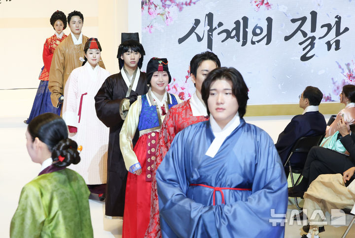 [서울=뉴시스] 황준선 기자 = 7일 서울 강남구 코엑스에서 열린 2025년 한복상점 개막 패션쇼에서 모델들이 런웨이를 걷고 있다. 2025.08.07. [email protected]