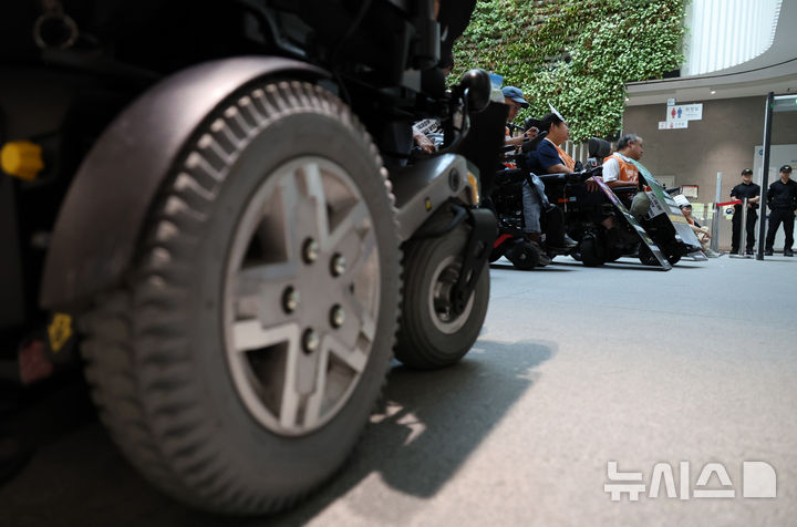 [세종=뉴시스] 강종민 기자 = 전국장애인차별철폐연대 등 장애인 단체 회원들이 7일 세종시 어진동 정부세종청사 민원동 로비에서 차별없는 지원대책 강화 등을 요구하며 점거농성을 벌이고 있다. 2025.08.07. [email protected]
