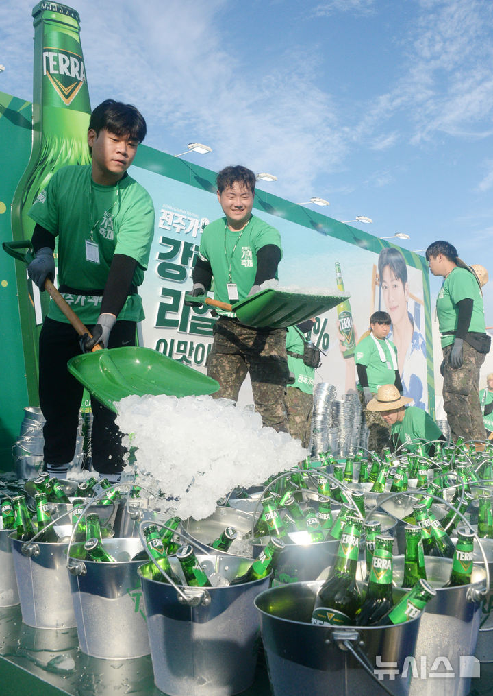 [전주=뉴시스] 김얼 기자 = 2025 전주가맥축제 개막일인 7일 전북 전주시 전주대학교 대운동장에서 가맥지기들이 시민들에게 제공할 맥주에 시원하게 얼음을 뿌리고 있다. 2025.08.07. [email protected]
