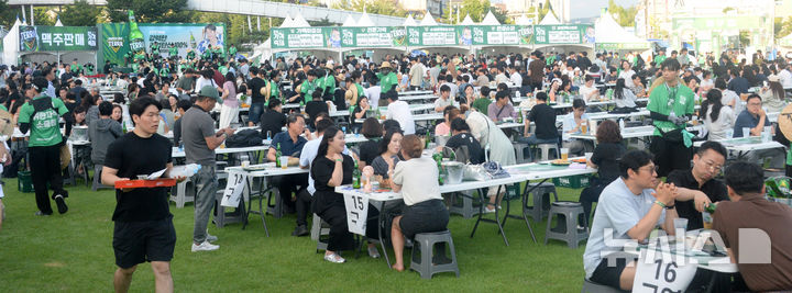[전주=뉴시스] 김얼 기자 = 2025 전주가맥축제 개막일인 7일 전북 전주시 전주대학교 대운동장을 찾은 시민들이 가맥축제를 즐기고 있다. 2025.08.07. [email protected]