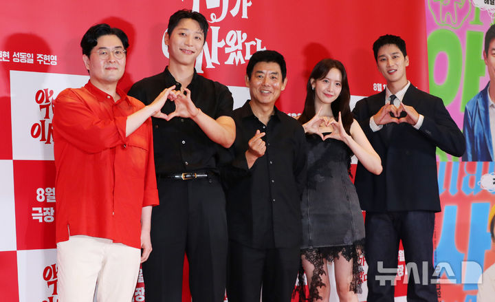 [서울=뉴시스] 김혜진 기자 = 이상근(왼쪽부터) 감독, 배우 신현우, 성동일, 임윤아, 안보현이 7일 오후 서울 용산구 CGV용산아이파크몰에서 열린 영화 '악마가 이사왔다'(감독 이상근) VIP 시사회에서 포즈를 취하고 있다. 2025.08.07. [email protected]