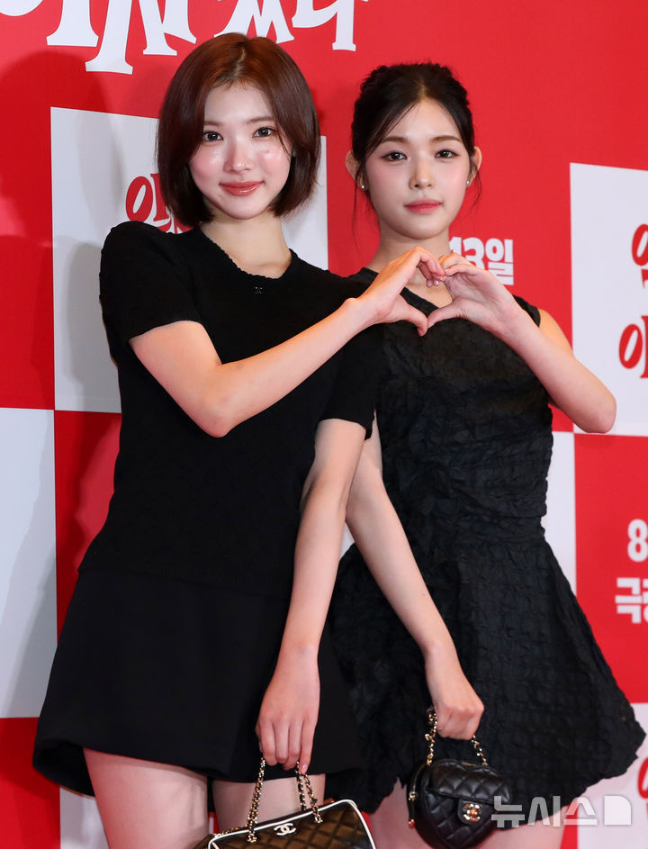 [서울=뉴시스] 김혜진 기자 = 그룹 하츠투하츠 지우(왼쪽), 유하가 7일 오후 서울 용산구 CGV용산아이파크몰에서 열린 영화 '악마가 이사왔다'(감독 이상근) VIP 시사회에서 포즈를 취하고 있다. 2025.08.07. [email protected]
