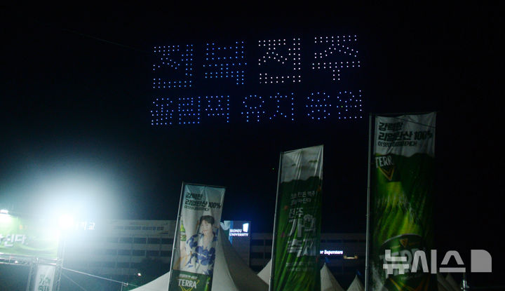 [전주=뉴시스] 김얼 기자 ='2025 전주가맥축제'가 열린 7일 전북 전주시 전주대학교 대운동장에서 개막식을 여는 드론쇼가 펼쳐지고 있다. 2025.08.07. [email protected]