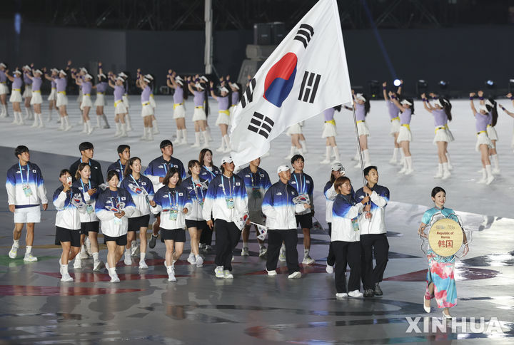 [청두=신화/뉴시스] 7일(현지 시간) 중국 쓰촨성 청두 톈푸 루프에서 열린 제12회 월드게임 개막식에서 한국 선수단이 입장하고 있다. 월드게임은 국제월드게임협회(IWGA) 주관으로 4년마다 열리는 비올림픽 종목 국제종합경기로 대한민국은 11개 종목에 출전한다. 2025.08.08.