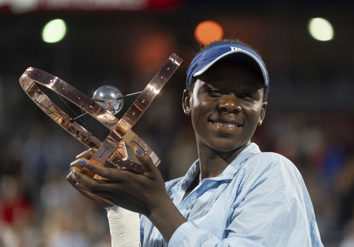 [몬트리올=AP/뉴시스] 빅토리아 음보코(85위·캐나다)가 7일(현지 시간) 캐나다 몬트리올에서 열린 여자프로테니스(WTA) 투어 옴니엄 뱅크 내셔널(WTA1000) 단식 정상에 올라 트로피를 들고 포즈를 취하고 있다. 음보코는 결승전에서 오사카 나오미(49위·일본)를 2-1(2-6 6-4 6-1)로 꺾고 생애 첫 투어 단식 우승을 차지했다. 2025.08.08.