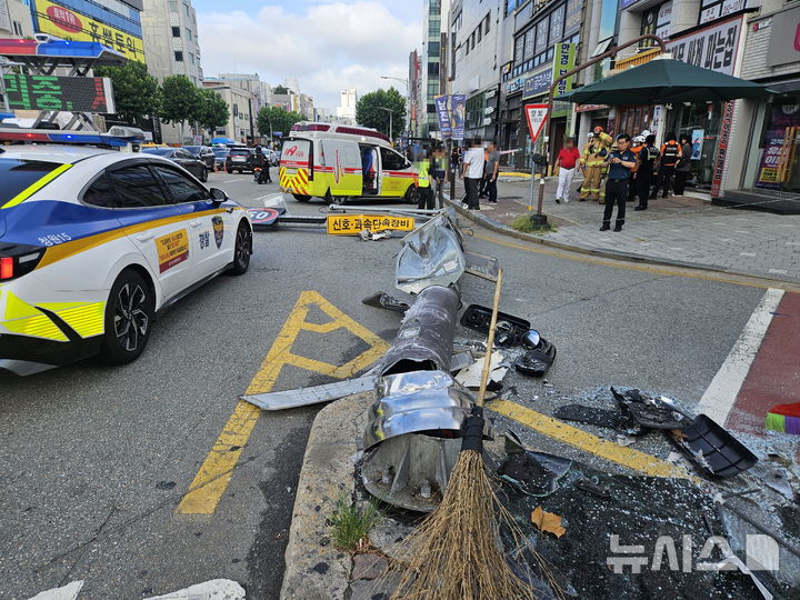 [청주=뉴시스] 8일 오전 7시38분께 충북 청주시 서원구 사창동 사창사거리에서 좌회전 하던 45인승 통근버스가 교통섬의 교통단속 카메라 전신주를 들이받았다. (사진=청주서부소방서 제공) 2025.08.08. [email protected]