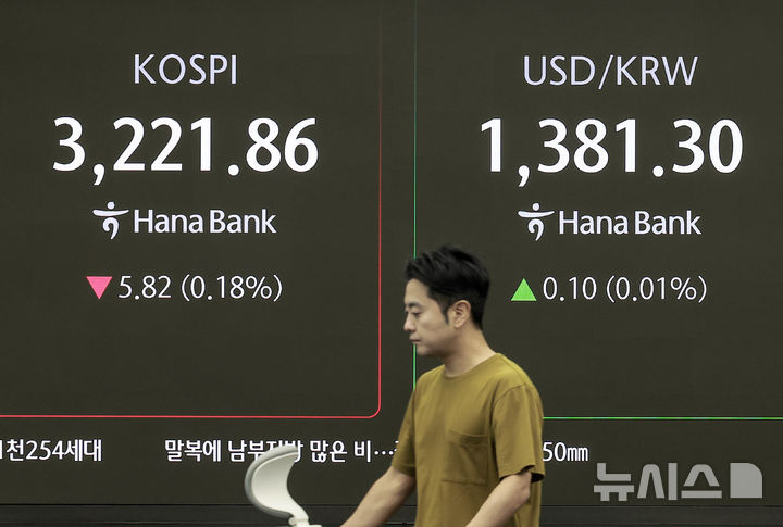 [서울=뉴시스] 정병혁 기자 = 8일 서울 중구 하나은행 딜링룸에서 직원들이 업무를 보고 있다. 코스피는 전 거래일(3227.68)보다 7.10포인트(0.22%) 하락한 3220.58에, 코스닥 지수는 전 거래일(805.81)보다 0.62포인트(0.08%) 오른 806.43에 거래를 시작했다. 서울 외환시장에서 원·달러 환율은 전 거래일 주간거래 종가(1381.2원)보다 0.4원 오른 1381.6원에 출발했다.2025.08.08. [email protected]