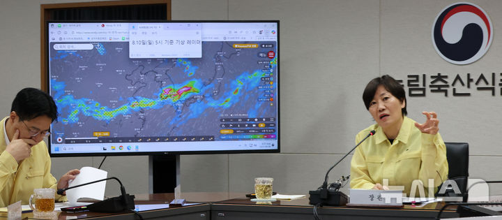 [세종=뉴시스] 강종민 기자 = 송미령 농림축산식품부 장관이 8일 세종시 정부세종청사 농업재해상황실에서 열린 호우 대비 추진상황 점검회의에서 농업분야 피해 최소화를 위한 분야별 추진상황을 점검하고 있다. 2025.08.08. [email protected]