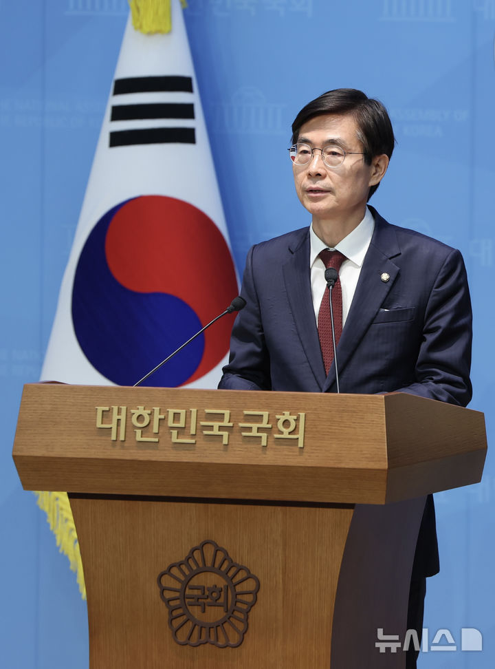 [서울=뉴시스] 김명년 기자 = 조경태 국민의힘 당대표 후보가 8일 오전 서울 여의도 국회 소통관에서 기자회견을 열고 김문수 후보에게 사퇴를 촉구하고 있다. 2025.08.08. [email protected]