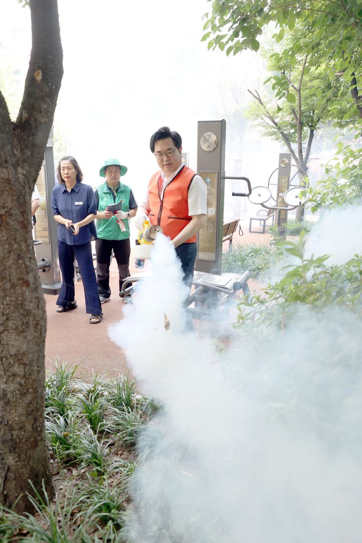 [서울=뉴시스] 박일하 동작구청장이 8일 서울 동작구 사당동 까치산 공원 일대에서 열린 사당5동 주민과 함께 여는' 굿모닝 동작! 톡톡 투어'에서 거리 대청소와 방역활동을 하고 있다. (사진=동작구 제공) 2025.08.08. [email protected] *재판매 및 DB 금지