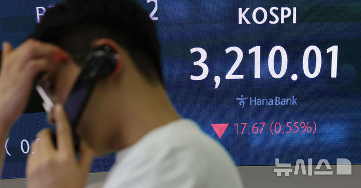 [서울=뉴시스] 홍효식 기자 = 코스피가 전 거래일(3227.68)보다 17.67포인트(0.55%) 내린 3210.01에 마감한 8일 오후 서울 중구 하나은행 딜링룸 전광판에 지수가 표시되고 있다.