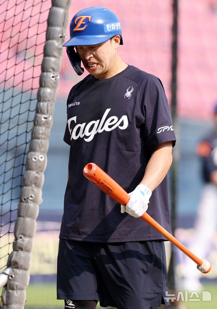 [서울=뉴시스] 이영환 기자 = 한화 손아섭이 8일 오후 서울 송파구 잠실야구장에서 진행되는 2025 KBO 리그 한화 이글스와 LG 트윈스의 경기를 앞두고 진행된 타격 훈련을 마친 후 이동하고 있다. 2025.08.08. [email protected]