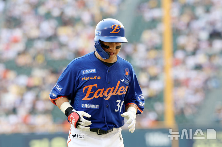 [서울=뉴시스] 이영환 기자 = 8일 오후 서울 송파구 잠실야구장에서 열린 2025 KBO 리그 한화 이글스와 LG 트윈스의 경기, 1회초 한화 선두타자 손아섭이 유격수 플라이 아웃으로 물러나고 있다. 2025.08.08. [email protected]