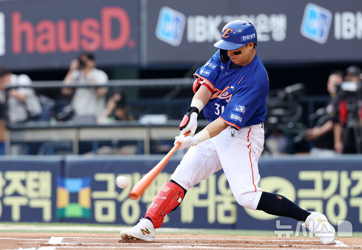 [서울=뉴시스] 이영환 기자 = 8일 오후 서울 송파구 잠실야구장에서 열린 2025 KBO 리그 한화 이글스와 LG 트윈스의 경기, 1회초 한화 선두타자 손아섭이 타격을 하고 있다. 결과는 유격수 플라이 아웃. 2025.08.08. [email protected]