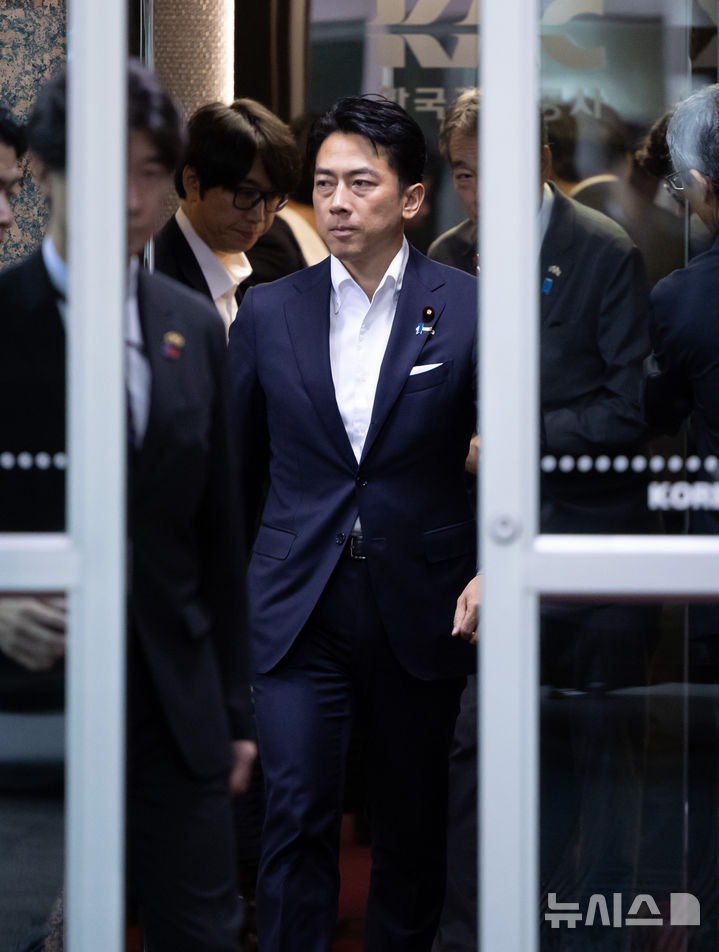 [서울=뉴시스] 황준선 기자 = 고이즈미 신지로(小泉進次郞) 일본 농림수산상이 9일 오후 APEC 식량안보장관회의 및 한일중 농업장관회의 등에 참석차 서울 강서구 김포국제공항을 통해 입국하고 있다. 2025.08.09. [email protected]