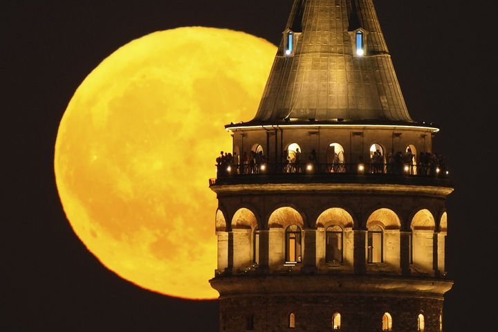 [이스탄불=AP/뉴시스] 9일(현지 시간) 튀르키예 이스탄불 갈라타 타워 뒤로 8월 보름달인 ‘철갑상어달’이 떠오르고 있다. '철갑상어달'이라는 이름은 북미 원주민들이 철갑상어가 가장 많이 잡히는 8월에 뜨는 달이라고 해서 생겨났다. 2025.08.10.