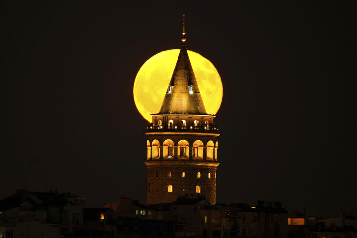 갈라타 타워 뒤로 지나가는 보름달