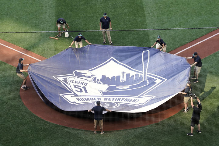 [시애틀=AP/뉴시스] 9일(현지 시간) 미 워싱턴주 시애틀의 T-모바일 파크에서 전 시애틀 매리너스 외야수 이치로 스즈키의 영구결번식이 열려 경기장 관계자들이 이치로 그림이 그려진 홈 플레이트 덮개를 설치하고 있다. 브루스 해럴 시애틀 시장은 8월 9일을 '이치로의 날'로 선포하기도 했다. 2025.08.10.