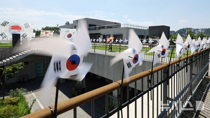 [서울=뉴시스] 최진석 기자 = 광복 80주년을 앞둔 10일 서울 노들섬에 역사 속의 태극기가 전시되어 있다.