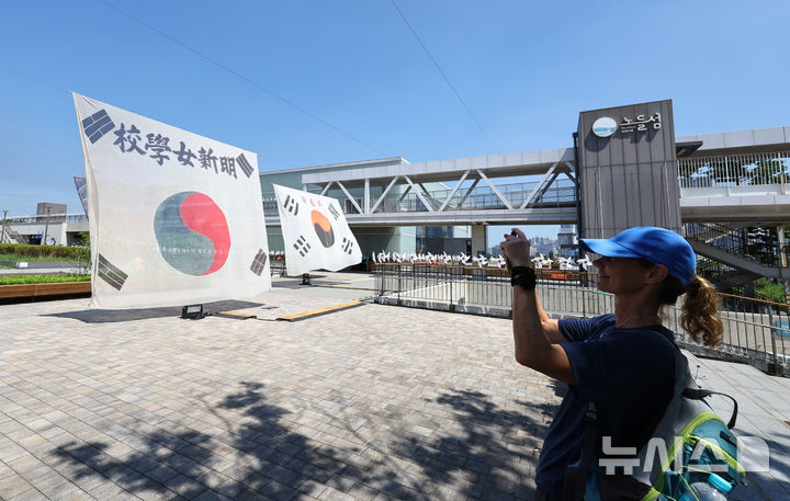[서울=뉴시스] 최진석 기자 = 광복 80주년을 앞둔 10일 서울 노들섬에 역사 속의 태극기가 전시되어 있다.