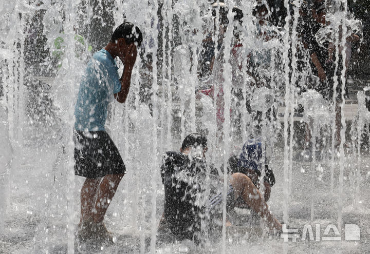 [서울=뉴시스] 김명원 기자 = 서울 등 내륙에 낮기온 33도의 무더위가 이어지는 가운데 10일 서울 종로구 광화문 광장 분수대에서 어린이들이 더위를 식히고 있다. 2025.08.10. [email protected]