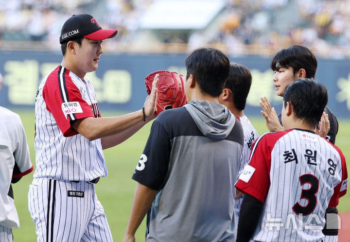 [서울=뉴시스] 조성우 기자 = 10일 오후 서울 송파구 잠실야구장에서 열린 2025 KBO리그 한화 이글스와 LG 트윈스의 경기, LG 선발투수 손주영이 1회 한화 공격을 삼자범퇴로 막은 뒤 밝은 표정으로 마운드를 내려오며 동료들과 하이파이브 하고 있다. 2025.08.10. [email protected]