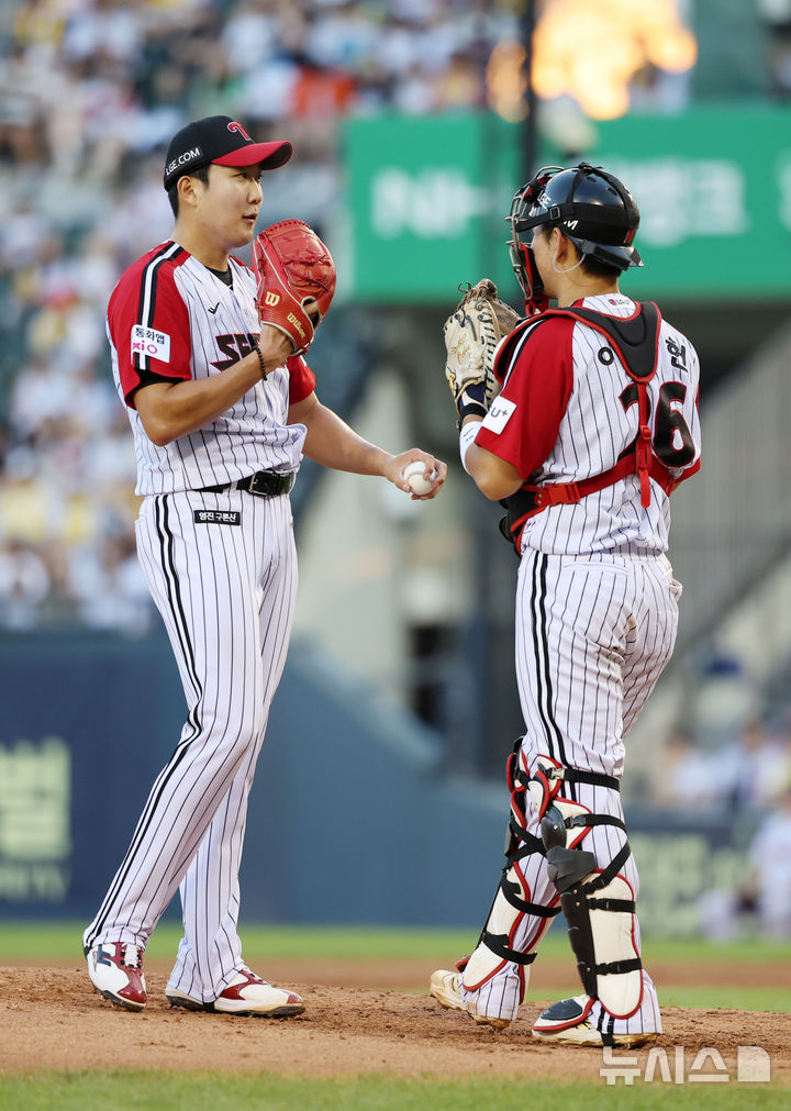 [서울=뉴시스] 조성우 기자 = 10일 오후 서울 송파구 잠실야구장에서 열린 2025 KBO리그 한화 이글스와 LG 트윈스의 경기, LG 선발투수 손주영이 한화 4회초 공격 2사 후 채은성과 이진영에게 연속 안타를 허용하자 포수 이주헌이 마운드에 올라가고 있다. 2025.08.10. [email protected]