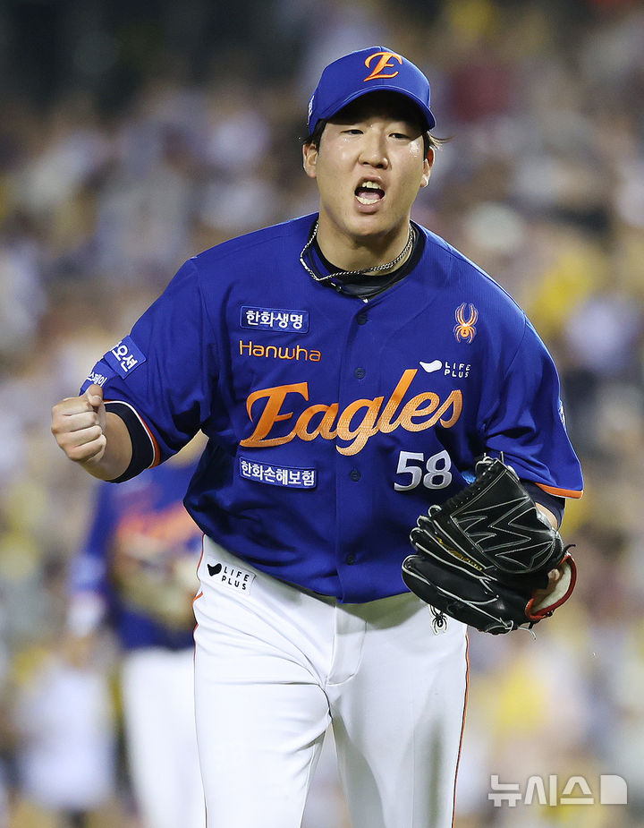 [서울=뉴시스] 조성우 기자 = 10일 오후 서울 송파구 잠실야구장에서 열린 2025 KBO리그 한화 이글스와 LG 트윈스의 경기, 한화 투수 박상원이 LG 7회말 공격 2사 주자 1, 2루서 오스틴을 2루수 직선타 아웃 처리한 뒤 환호하고 있다. 2025.08.10. [email protected]