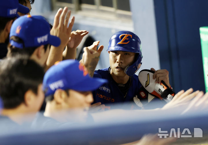 [서울=뉴시스] 조성우 기자 = 10일 오후 서울 송파구 잠실야구장에서 열린 2025 KBO리그 한화 이글스와 LG 트윈스의 경기, 한화 9회초 공격 1사 주자 3루서 리베라토의 1타점 희생타 때 3루주자 심우준이 홈에서 세이프된 뒤 동료들과 하이파이브하고 있다. 2025.08.10. [email protected]
