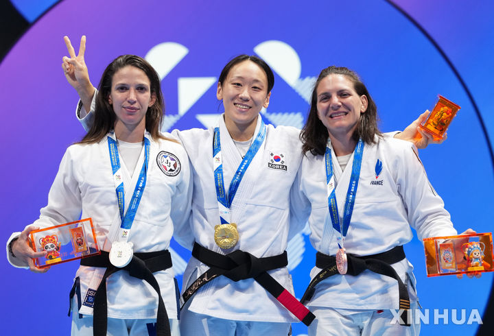[청두=신화/뉴시스] 성기라(가운데)가 10일(현지 시간) 중국 쓰촨성 청두에서 열린 제12회 월드게임 주짓수 네와자 여자 63㎏급 정상에 올라 시상대에서 기념 촬영하고 있다. 성기라는 결승에서 메시 로젠펠드(이스라엘)를 꺾고 금메달을 목에 걸었다. 2025.08.11.