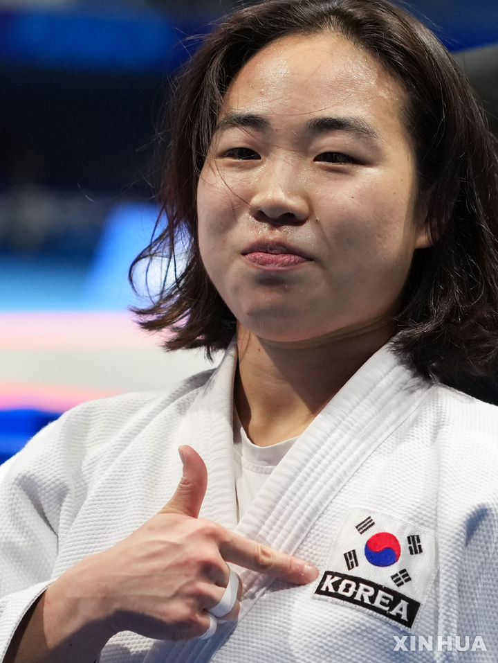 [청두=신화/뉴시스] 임언주가 10일(현지 시간) 중국 쓰촨성 청두에서 열린 제12회 월드게임  주짓수 네와자 여자 52㎏급 결승에서 제나 나폴리스(필리핀)를 꺾고 금메달을 따낸 뒤 가슴의 태극 마크를 가리키고 있다. 2025.08.11.
