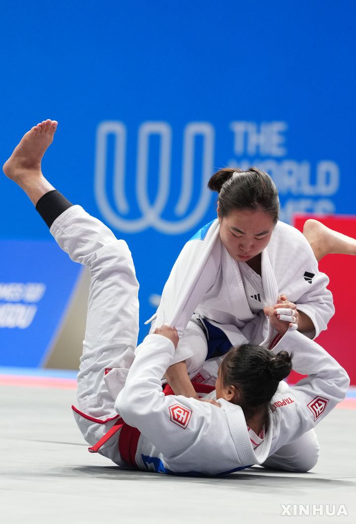 [청두=신화/뉴시스] 임언주(위)가 10일(현지 시간) 중국 쓰촨성 청두에서 열린 제12회 월드게임 주짓수 네와자 여자 52㎏급 결승에서 제나 나폴리스(필리핀)와 경기하고 있다. 임언주가 승리하고 금메달을 목에 걸었다. 2025.08.11.