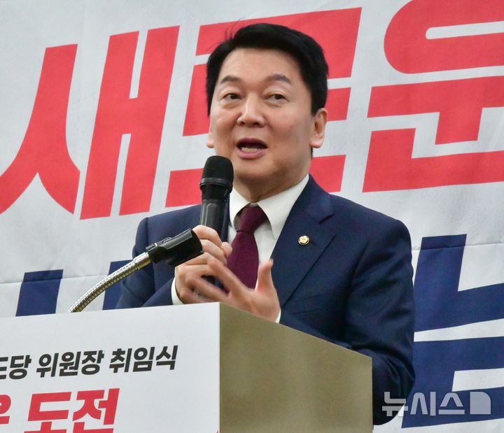 [광주=뉴시스] 이현행 기자 = 안철수 국민의힘 당대표 후보가 11일 오후 광주 서구 홀리데이인호텔에서 김화진 국힘 전남도당위원장 취임식에 참석해 발언하고 있다. 2025.08.11. [email protected]
