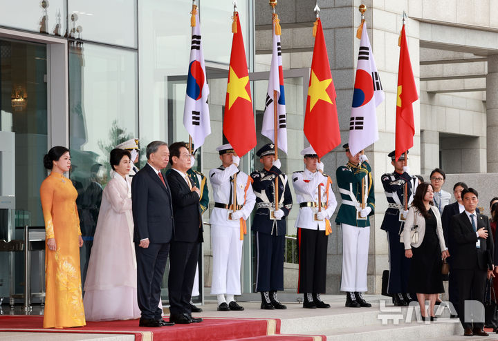 [서울=뉴시스] 고범준 기자 = 이재명 대통령과 김혜경 여사가 11일 서울 용산 대통령실 청사 앞에서 열린 또 럼 베트남 당서기장 공식환영식에서 국기에 경례를 하고 있다. 2025.08.11. [email protected]