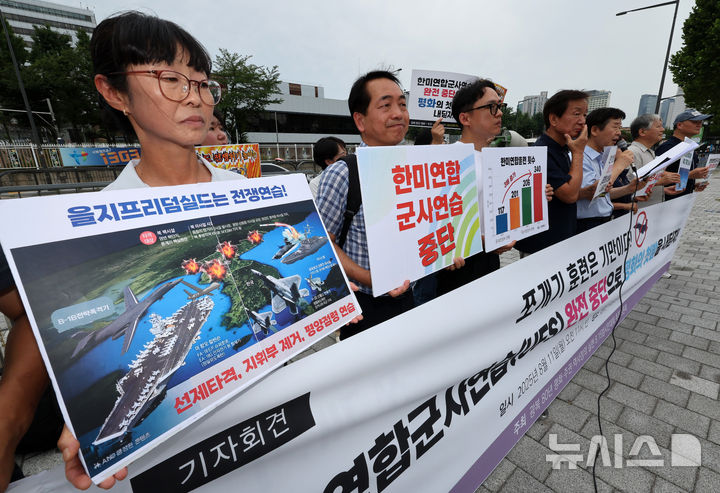 [서울=뉴시스] 배훈식 기자 = 광복 80년 평화·주권·역사정의 실현 8.15범시민대회 추진위원회 구성원들이 11일 오전 서울 용산구 대통령실 앞에서 기자회견을 열고 한미연합군사연습(UFS) 완전 중단을 촉구하고 있다. 2025.08.11. [email protected]