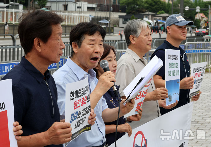 [서울=뉴시스] 배훈식 기자 = 광복 80년 평화·주권·역사정의 실현 8.15범시민대회 추진위원회 구성원들이 11일 오전 서울 용산구 대통령실 앞에서 기자회견을 열고 한미연합군사연습(UFS) 완전 중단을 촉구하고 있다. 2025.08.11. [email protected]