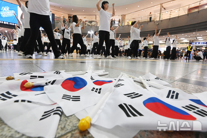 [수원=뉴시스] 김종택 기자 = 제80주년 광복절을 나흘 앞둔 11일 경기 수원역 대합실에서 수원시 권선구 주민자치 프로그램 수강생들이 '광복 그날의 기쁨'을 재현하는 플래시몹 공연을 진행하고 있다. 2025.08.11. [email protected]