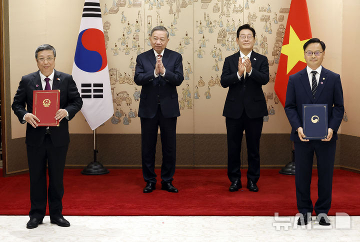 [서울=뉴시스] 최동준 기자 = 김성범 해양수산부 차관과 황 쭝 농업환경부 차관이 11일 서울 용산 대통령실 청사에서 이재명 대통령과 또 럼 베트남 당 서기장이 임석한 가운데 열린 양해각서(MOU) 서명식에서 수산 협력 MOU에 서명 뒤 기념촬영을 하고 있다. 2025.08.11. [email protected]