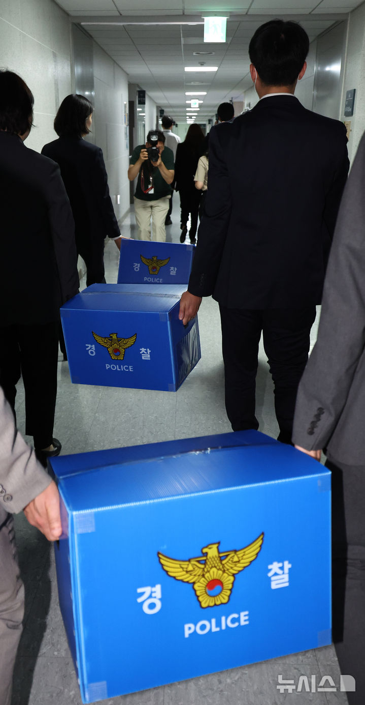 [서울=뉴시스] 김금보 기자 = 서울경찰청 금융범죄수사대 직원들이 11일 오후 서울 여의도 국회 의원회관 이춘석 무소속 의원실에서 압수품을 들고 나오고 있다. 이 의원은 주식 차명거래 의혹 등을 받고 있다. 2025.08.11. [email protected]