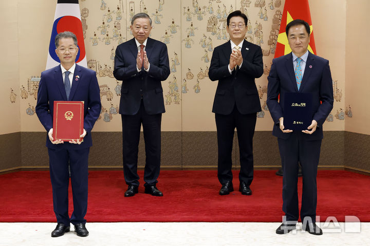 [서울=뉴시스] 최동준 기자 = 정장선 평택시장과 응우옌 반 꽝 다낭시 당서기가 11일 서울 용산 대통령실 청사에서 이재명 대통령과 또 럼 베트남 당 서기장이 임석한 가운데 열린 양해각서(MOU) 서명식에서 평택시-다낭시 간 협력 MOU에 서명 뒤 기념촬영을 하고 있다. 2025.08.11. [email protected]