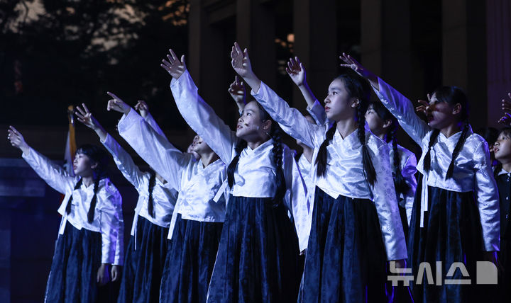 [서울=뉴시스] 이영환 기자 = 11일 오후 서울 중구 덕수궁 석조전 앞에서 열린 광복 80주년 특별전 '빛을 담은 항일유산' 개막행사에서 오프닝 공연이 진행되고 있다. 2025.08.11. [email protected]