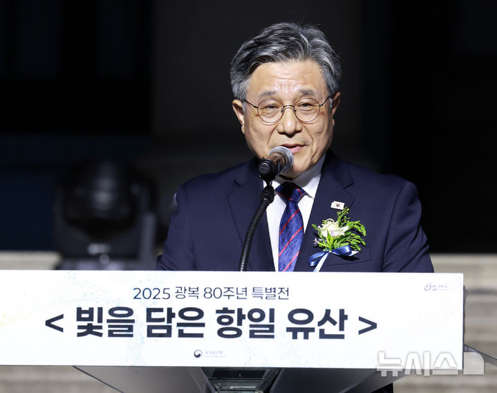 [서울=뉴시스] 이영환 기자 = 허민 국가유산청장이 11일 오후 서울 중구 덕수궁 석조전 앞에서 열린 광복 80주년 특별전 '빛을 담은 항일유산' 개막행사에 참석해 기념사를 하고 있다. 2025.08.11. [email protected]